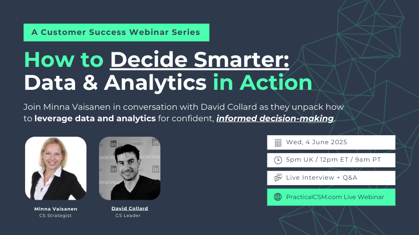 Join us for a live webinar hosted by Minna Vaisanen (Customer Success Strategist), featuring David Collard (Customer Success Leader), as they explore how data and analytics can drive more confident, informed decision-making in Customer Success.